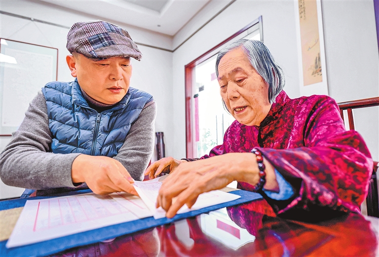 丁纪园、宋大年母子俩正在为古琴研讨打谱。