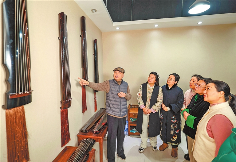 在“绿绮室”古琴文化展厅,宋大年为学员讲解各式古琴背后的历史与工艺,让学员不仅学“弹琴”,更懂“识琴”。