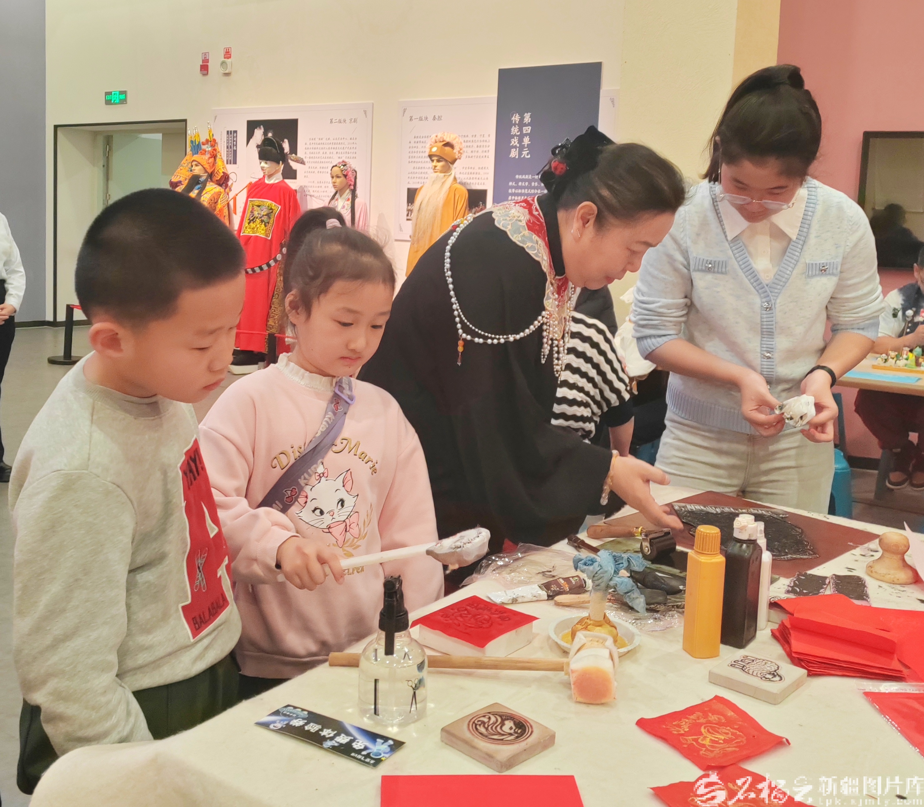 春节假期,在乌鲁木齐市博物馆,甄岐国(右2)传授观众雕版拓印技艺。天山网-新疆日报记者贾春霞摄
