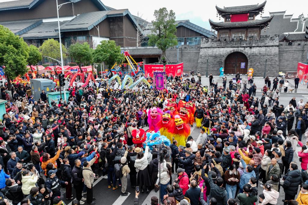 3月3日,市民和游客在张家界市永定区观看巡游演出(无人机照片)。新华社记者陈思汗 摄