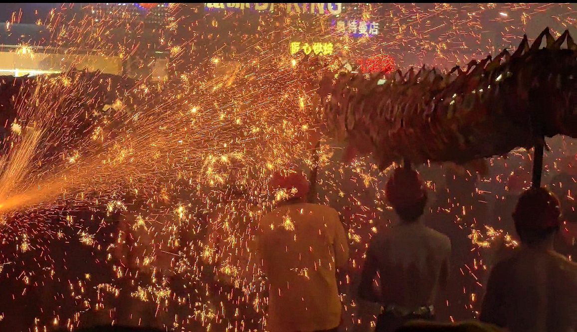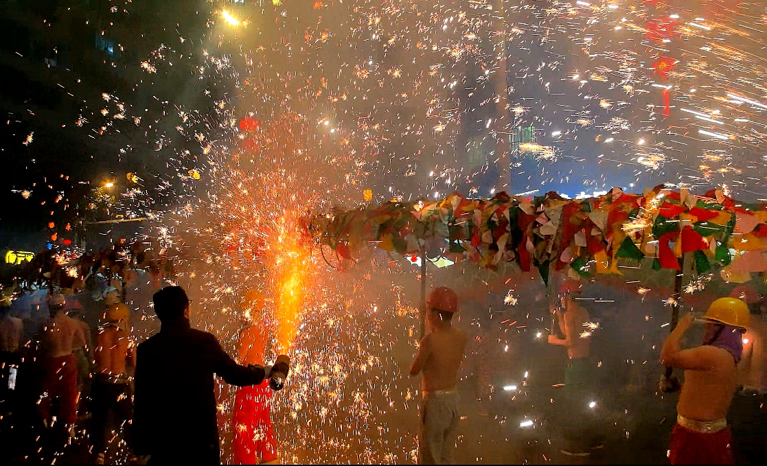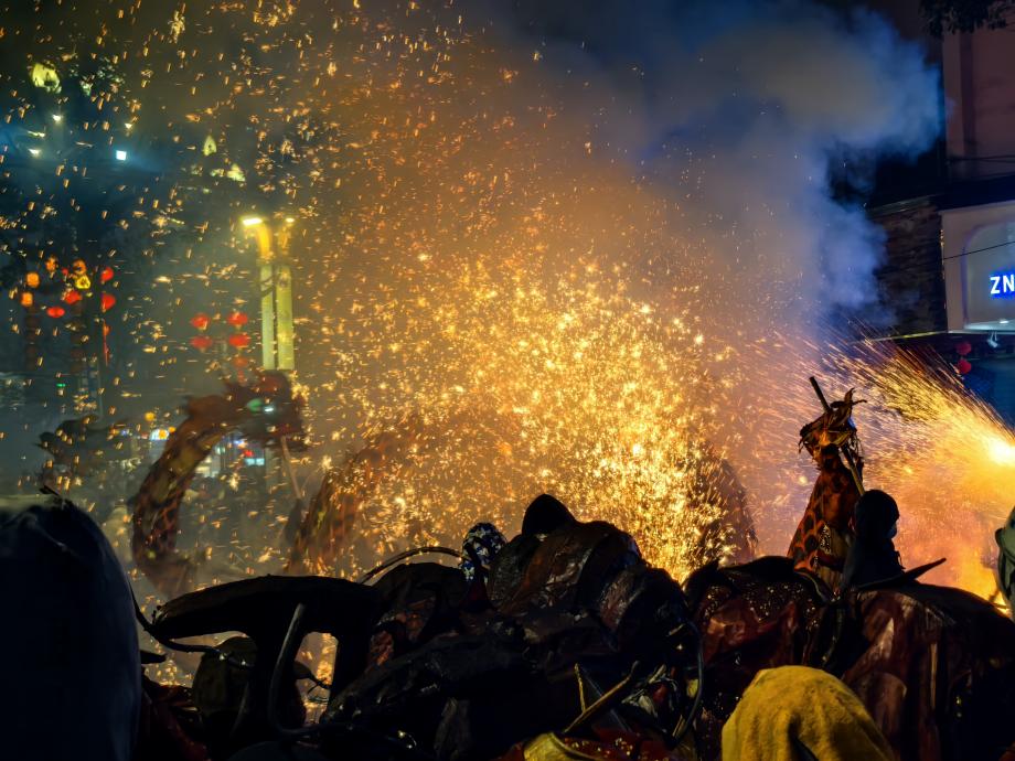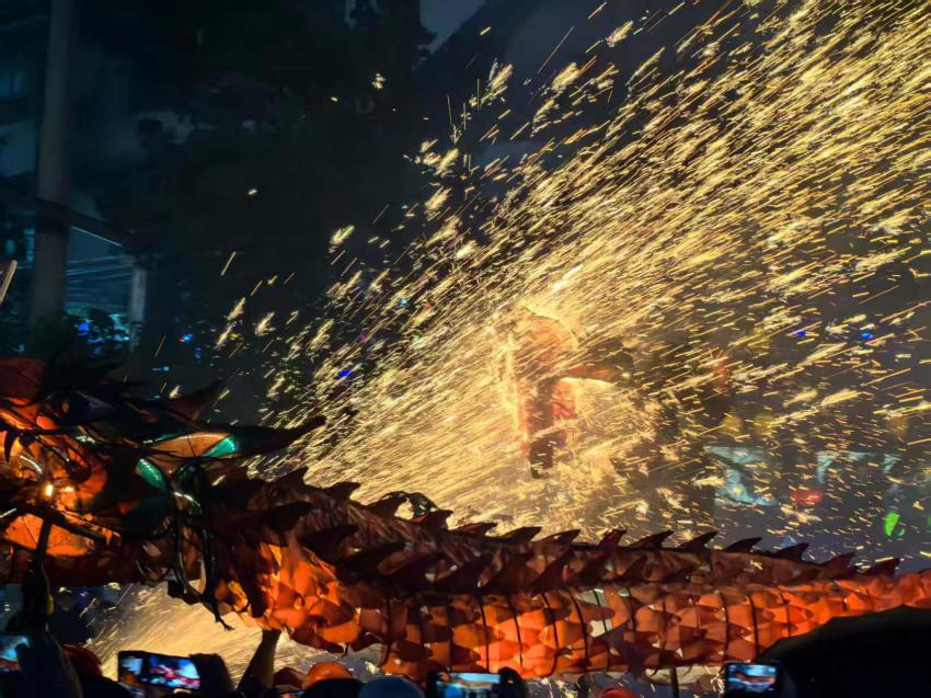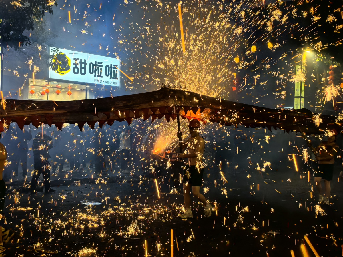 台江的“舞龙嘘花”独具特色,观众手持当地自制的嘘花筒,对准游走的祥龙喷射出灿烂火花。当晚,60余条祥龙穿行于街巷,在万千嘘花绽放中腾跃游走,整座城市沸腾在热烈喜庆的氛围中,人们以此祈愿风调雨顺、国泰民安。