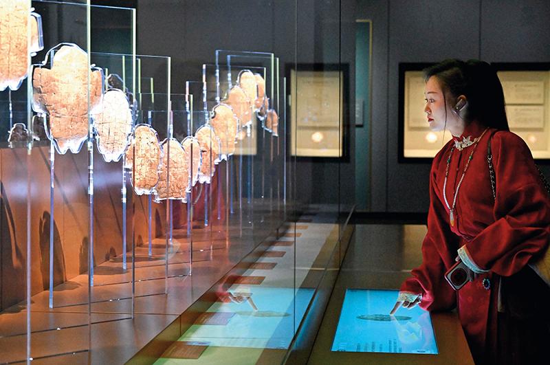 参观者在河南安阳殷墟博物馆新馆内观看展出的刻辞卜甲(2024 年 2 月 26 日摄) 李安摄 / 本刊