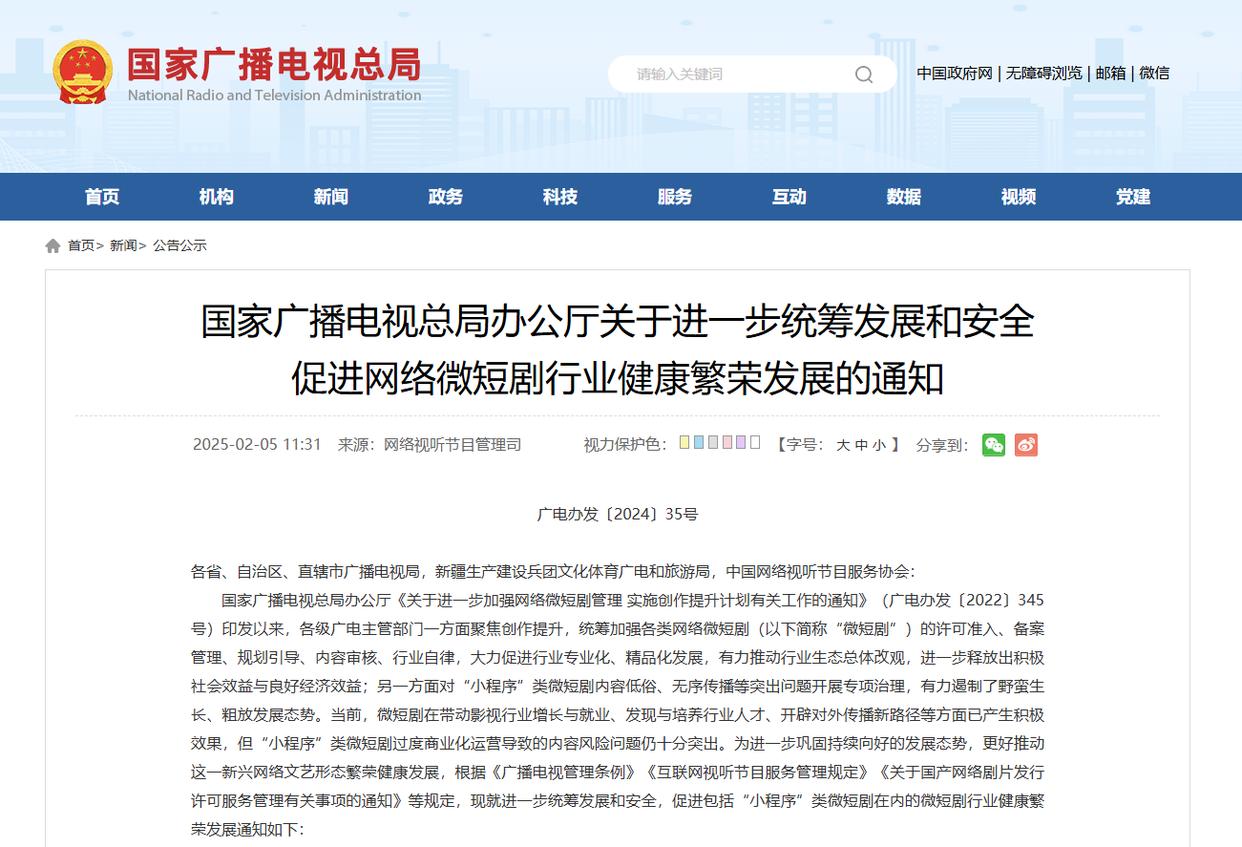 国家广播电视总局办公厅发布《关于进一步统筹发展和安全促进网络微短剧行业健康繁荣发展的通知》