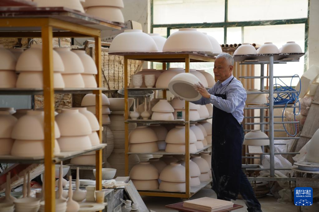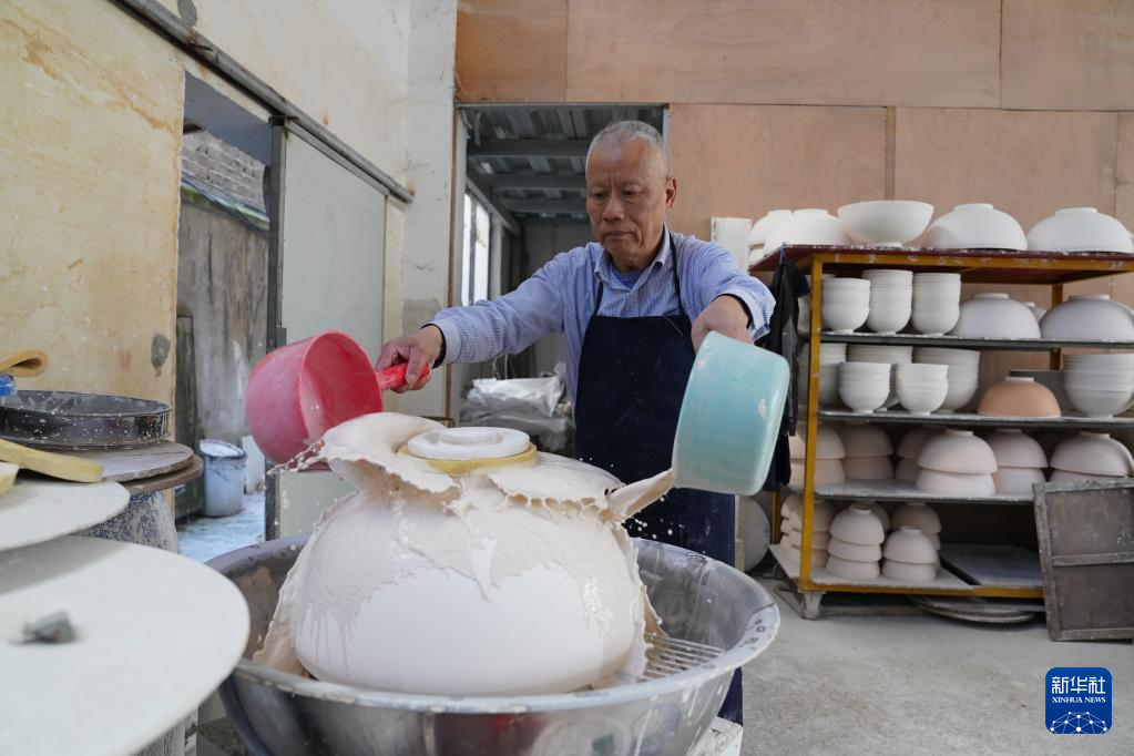 卢建德在给薄胎瓷碗上釉(3月10日摄)。新华社记者 周密 摄
