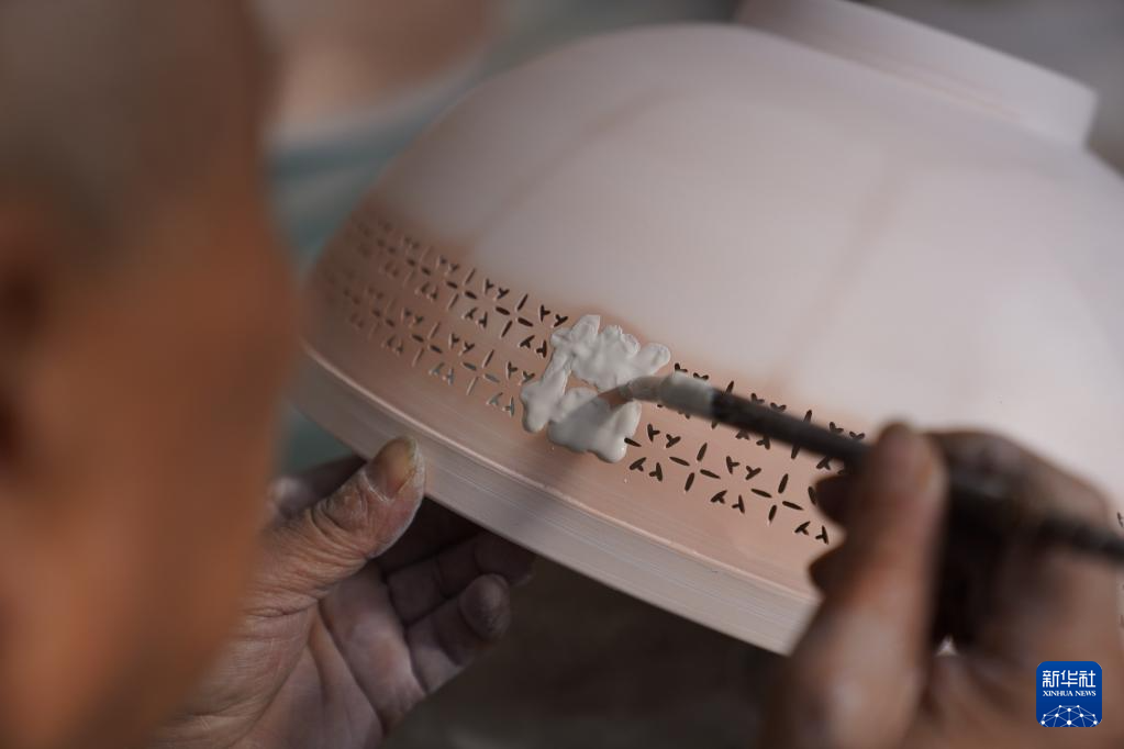 卢建德在给薄胎瓷碗进行“填釉”工序(3月10日摄)。新华社记者 周密 摄