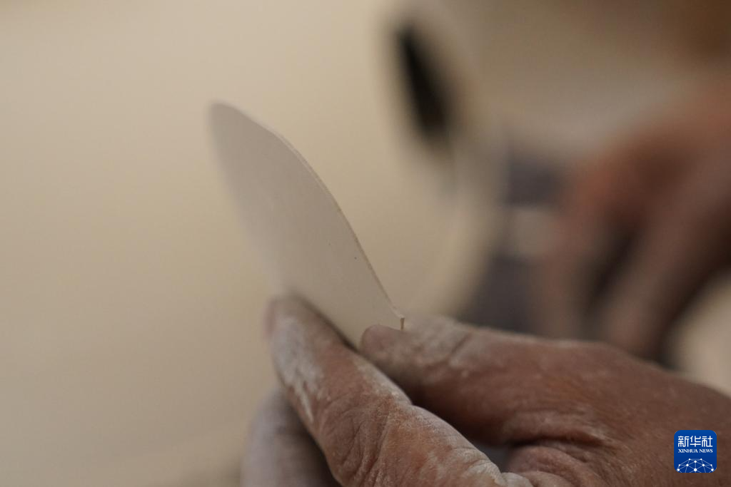 卢建德轻轻敲打薄胎瓷碗坯体,以此判断厚度是否达标(3月10日摄)。新华社记者 周密 摄