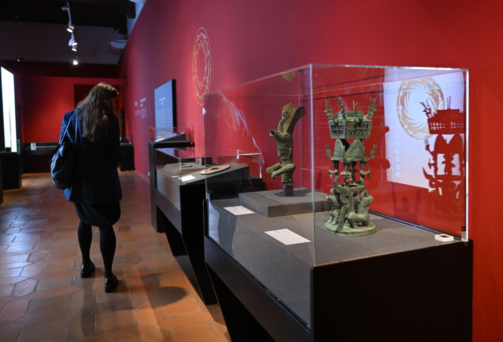 3月17日,在西班牙瓜达拉哈拉博物馆,一名女子参观中国西南地区青铜文明展。新华社记者 程敏 摄