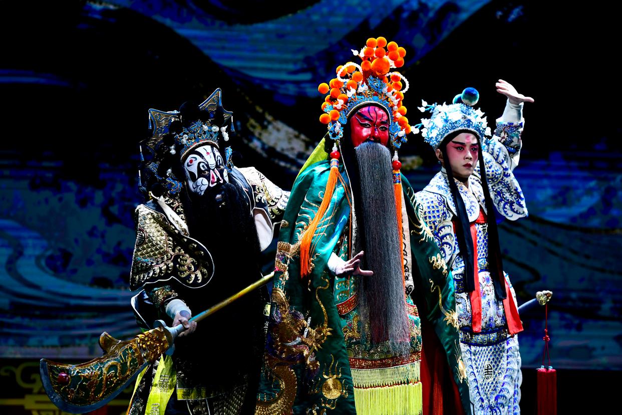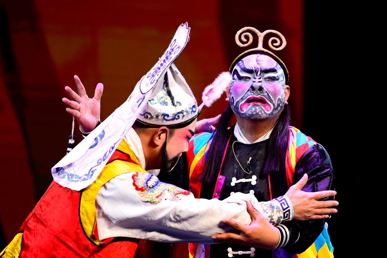 3月20日,在博兴县市民文化中心,来自广东省陆丰市正字戏传承保护中心的戏曲演员在表演正字戏《昊天塔·五台山会兄》。新华社记者 郭绪雷 摄