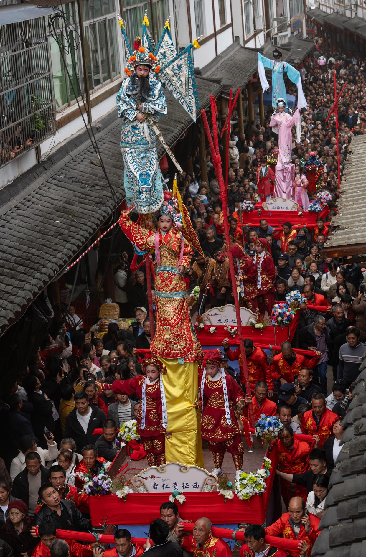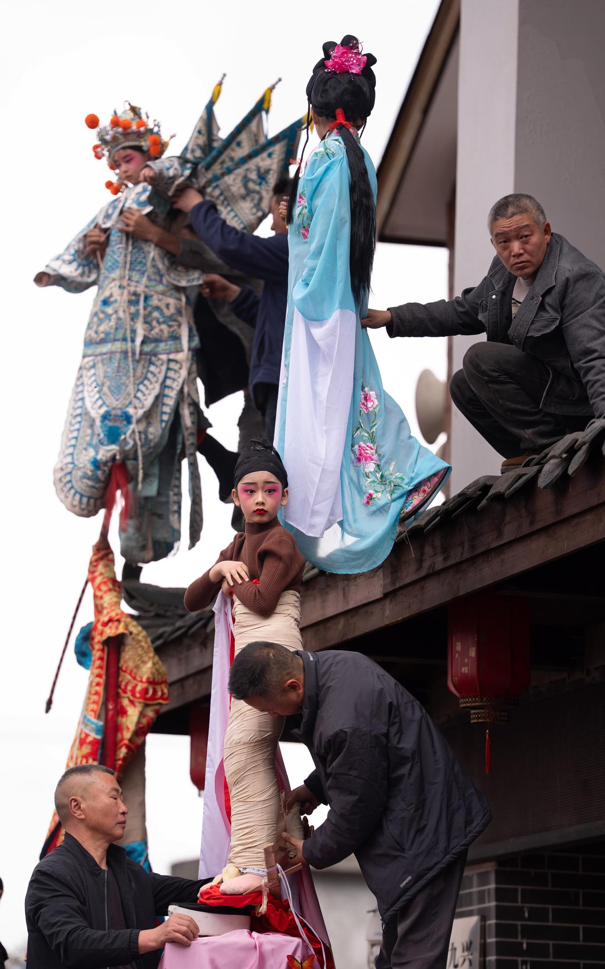 3月20日至21日,四川省兴文县九丝城镇、大坝苗族乡举办兴文建武僰道木台铁桩戏、大坝高装巡游活动,为来自全国各地的观众呈现了一场流动的民俗盛宴。大坝高装是国家级非物质文化遗产代表性项目、兴文建武僰道木台铁桩戏是四川省级非物质文化遗产代表性项目。它们以木台为基、铁桩为架,由10岁左右儿童扮演角色,立于铁桩顶端凌空展演。剧目多取材于民间故事,承载着群众平安顺遂、五谷丰登的美好祈愿。