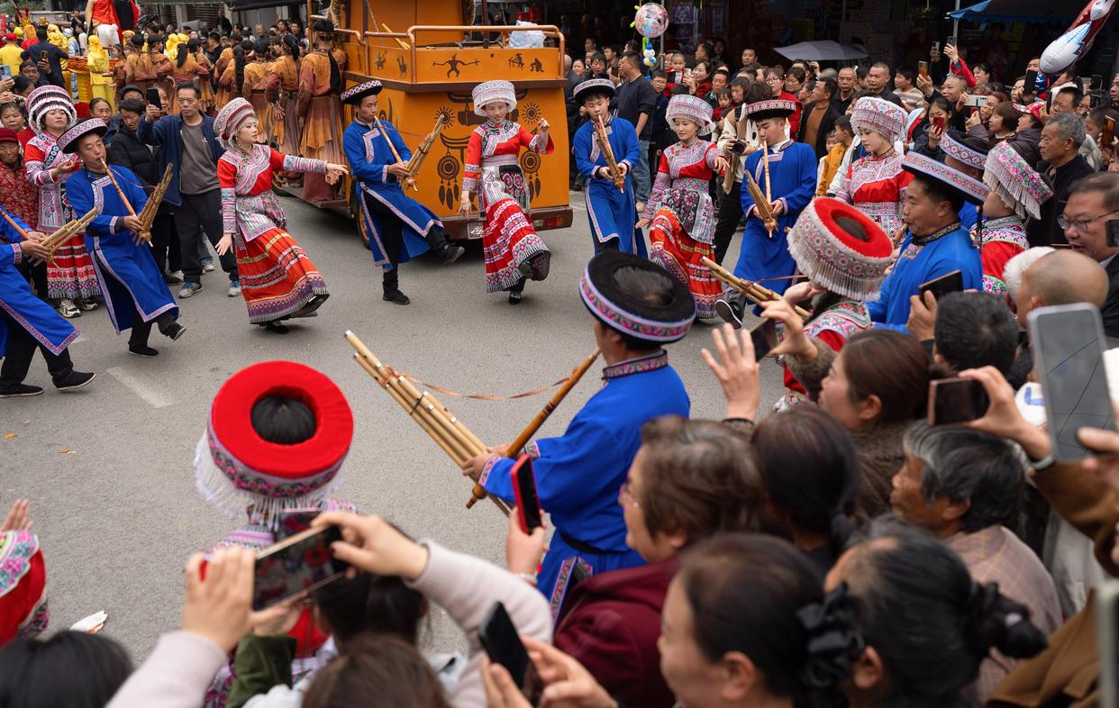 3月21日,在四川省兴文县大坝苗族乡晏州社区,大坝高装非遗巡游队伍中的苗族群众载歌载舞。新华社记者 江宏景 摄