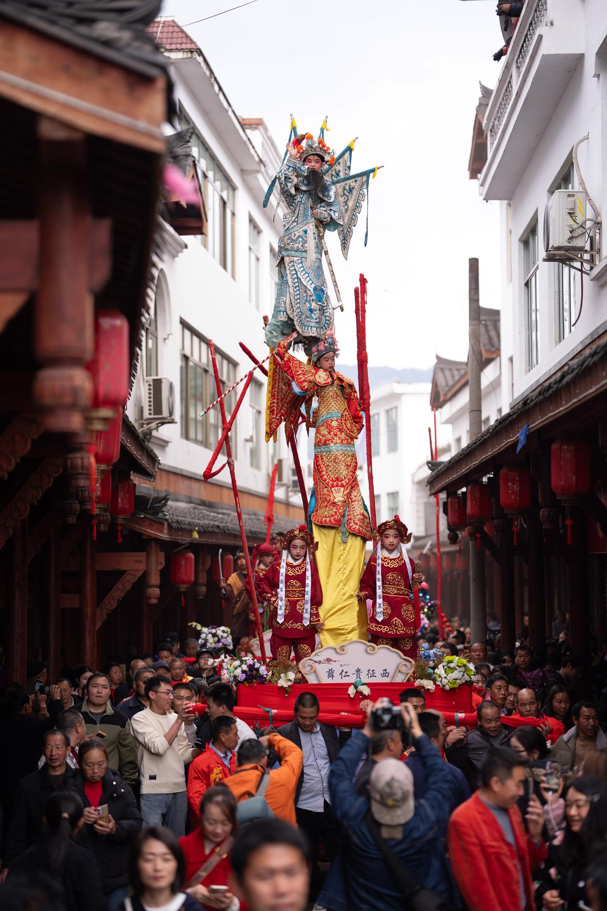 3月20日,四川省兴文县九丝城镇建武村,演员在巡游活动中表演木台铁桩戏《薛仁贵征西》。新华社记者 江宏景 摄