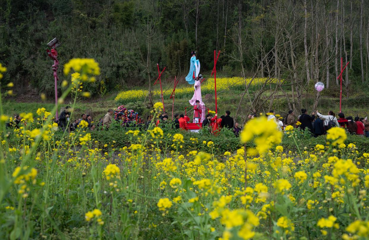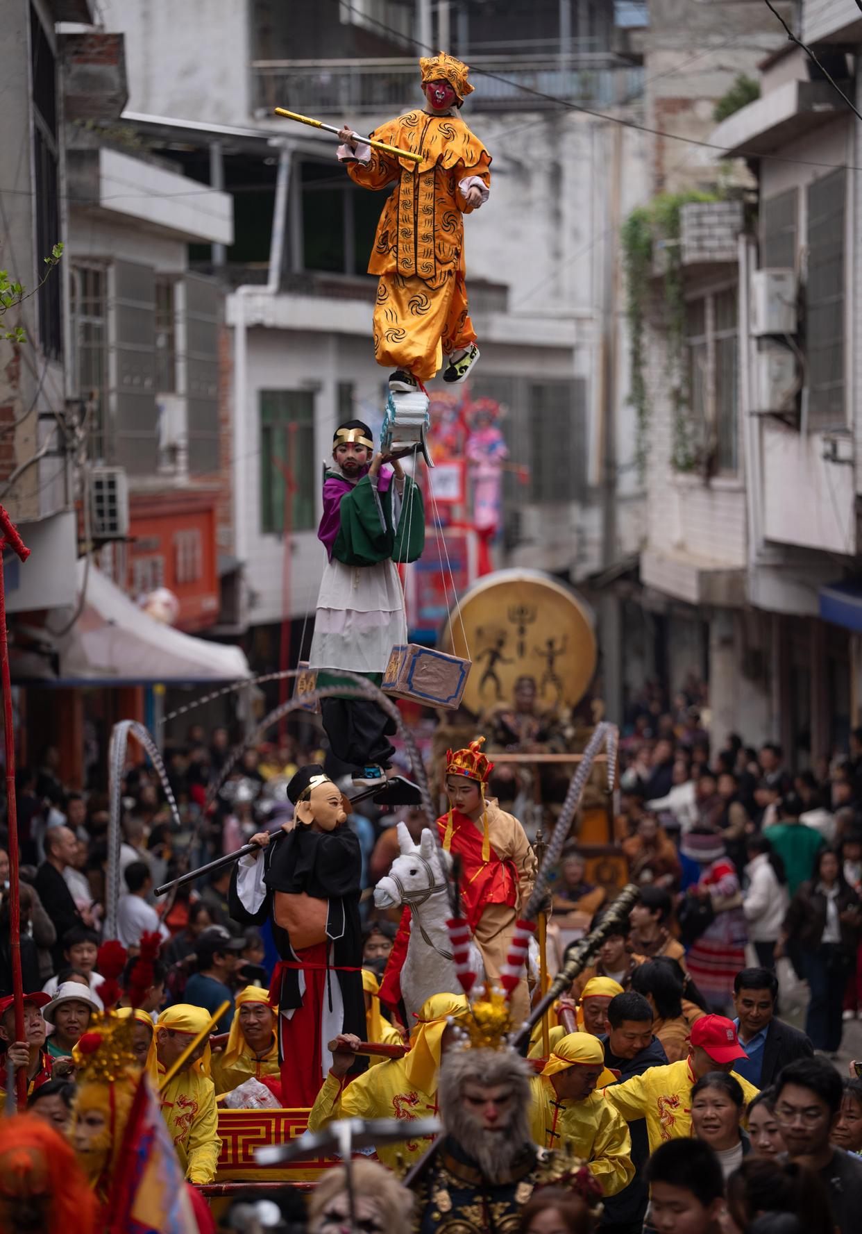 3月21日,四川省兴文县大坝苗族乡晏州社区,演员在巡游活动中表演大坝高装《西游记》。新华社记者 江宏景 摄