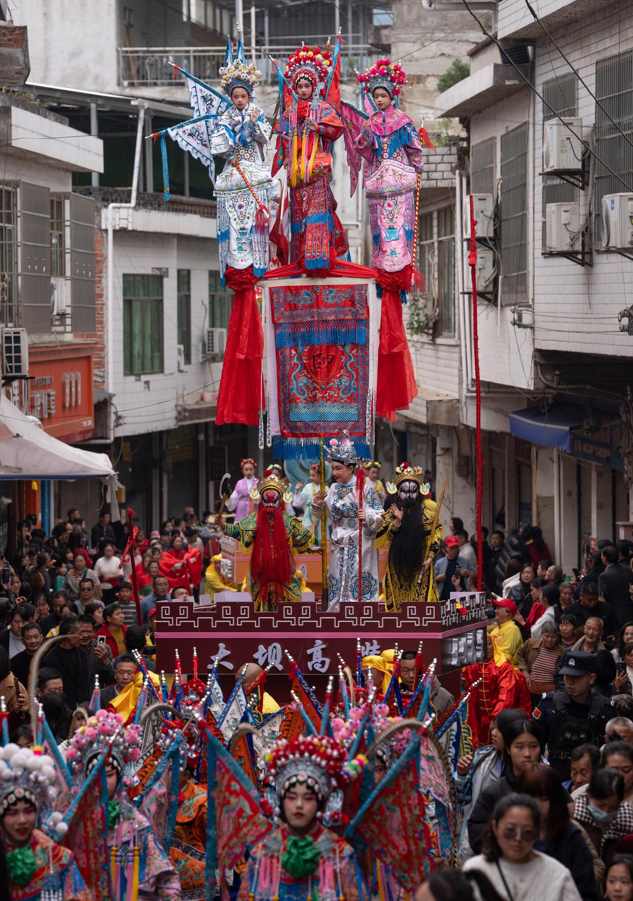 3月21日,四川省兴文县大坝苗族乡晏州社区,演员在巡游活动中表演大坝高装《穆桂英挂帅》。新华社记者 江宏景 摄