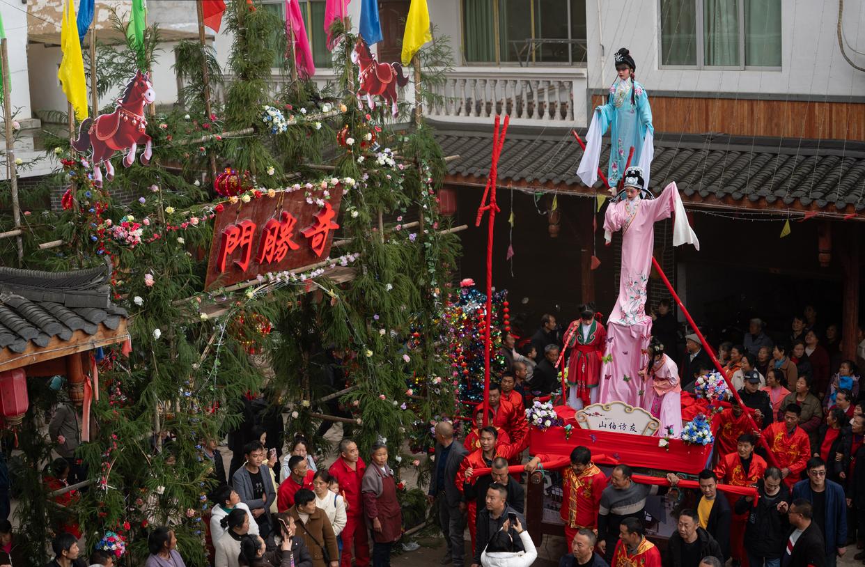 3月20日,四川省兴文县九丝城镇建武村,演员在巡游活动中表演木台铁桩戏《山伯访友》。新华社记者 江宏景 摄
