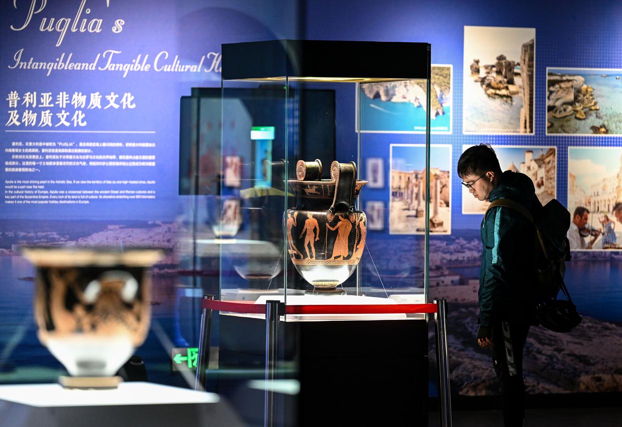 展览意大利方总策展人、普利亚大区旅游与文化部推广专员安娜·露西亚·泰佩斯塔表示,普利亚的自然馈赠——橄榄油、葡萄酒、海洋资源以及音乐、传统等,都与古希腊神话紧密相连。“我们希望通过文物,让中国民众更好认识普利亚的富饶与魅力,推动文化相知相亲。”