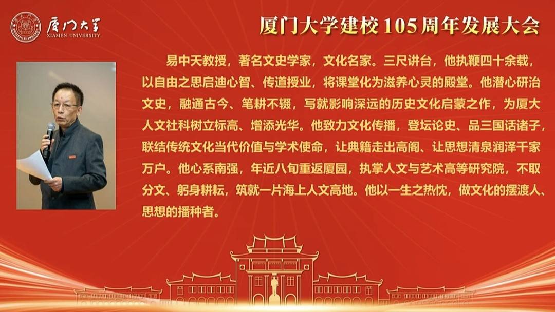 4月6日,厦门大学建校105周年发展大会上,著名学者、文化名人易中天被授予“南强杰出贡献奖”。