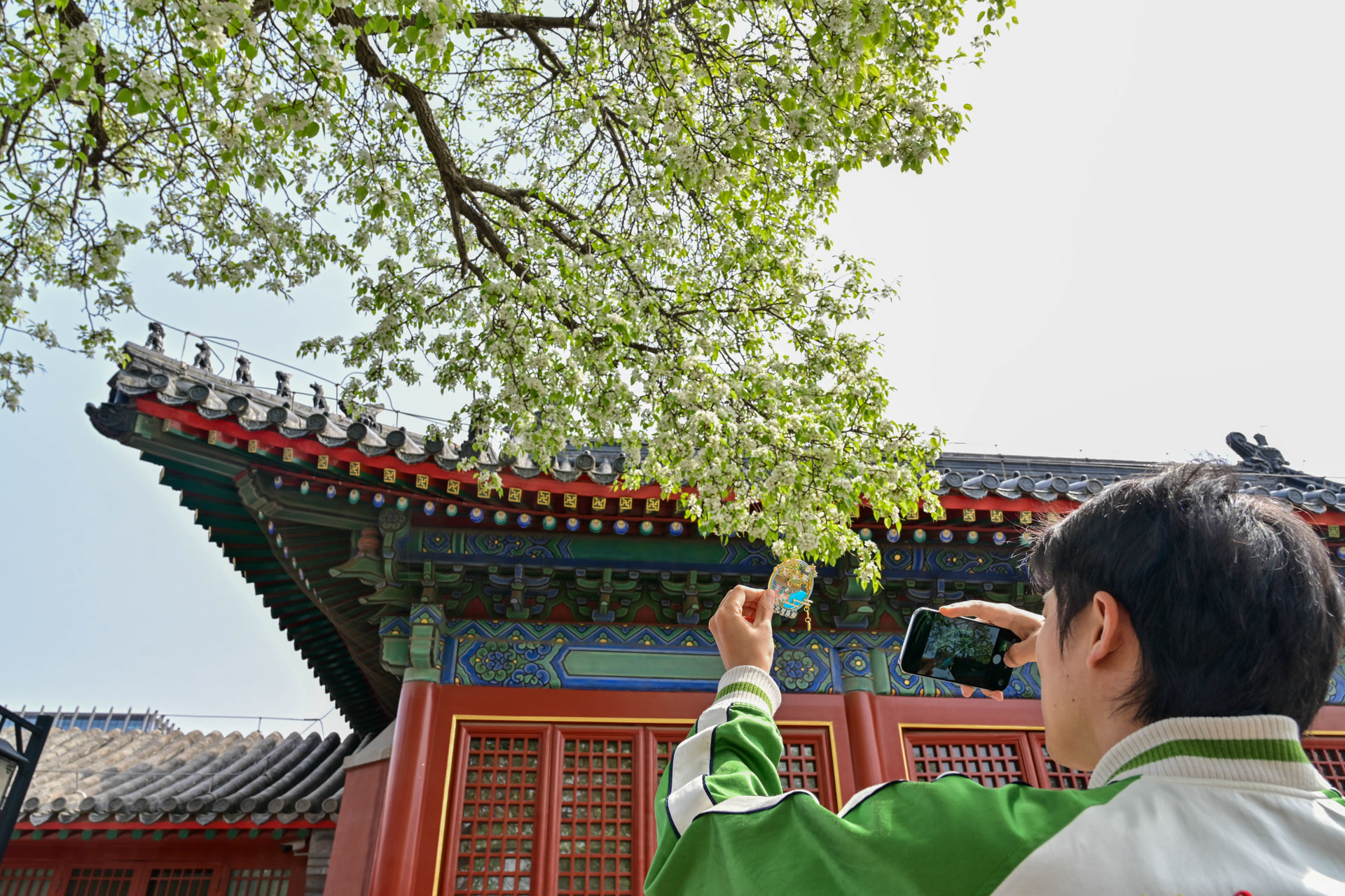 智化寺内,观众拍摄梨花冰箱贴与梨花同框。