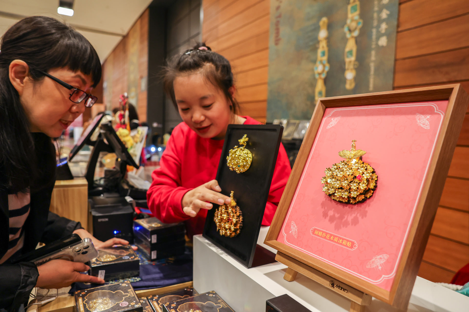 观众选购闹蛾金钗冰箱贴。