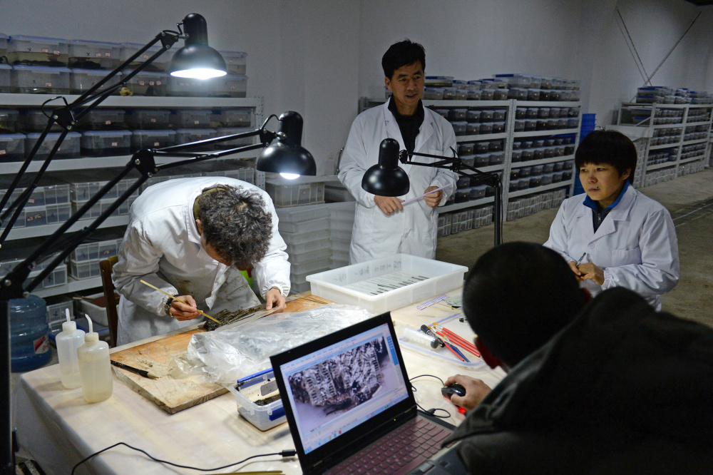 2015年11月24日,考古文保人员在位于江西南昌的海昏侯墓遗址文保用房内对出土的竹简进行剥离(资料照片)。新华社记者 万象 摄