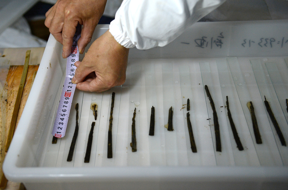 2015年11月24日,考古文保人员在位于江西南昌的海昏侯墓遗址文保用房内对出土的竹简进行测量(资料照片)。新华社记者 万象 摄
