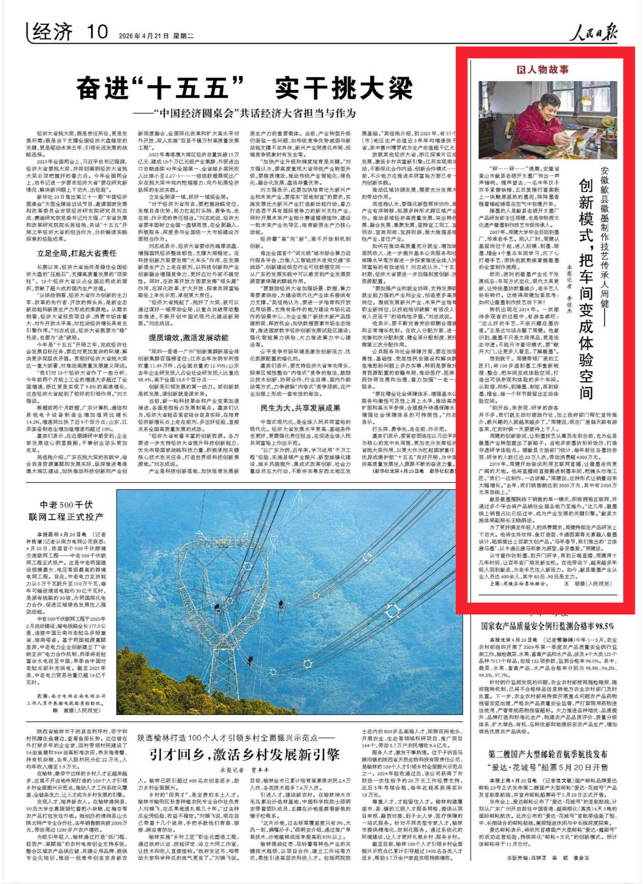 从守着作坊制墨,到开门研学,再到云端直播,周健用十几年时间,让百年老厂焕发新生机。在他带动下,越来越多年轻人回到歙县,为老手艺注入新活力。如今,歙县徽墨产业从业人员达600余人,其中80后、90后是主力。