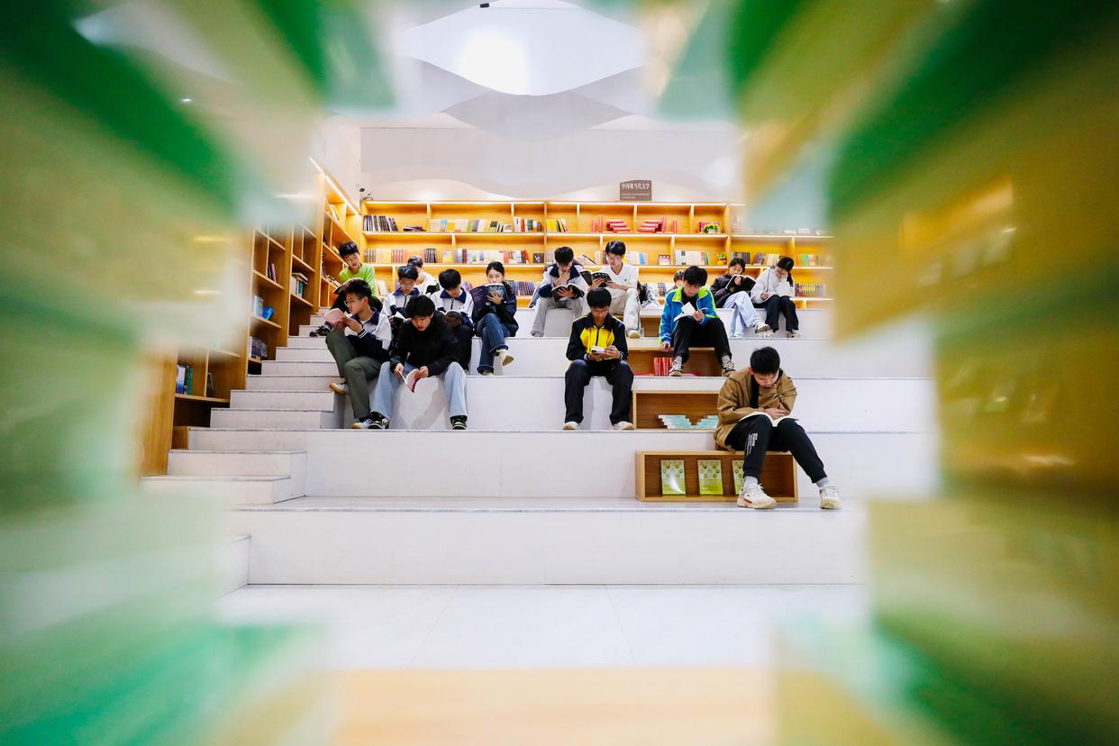 ↑2026年4月21日,学生们在湖南省永州市新田县第一中学校园书店内阅读书籍。CICPHOTO/刘贵雄 摄