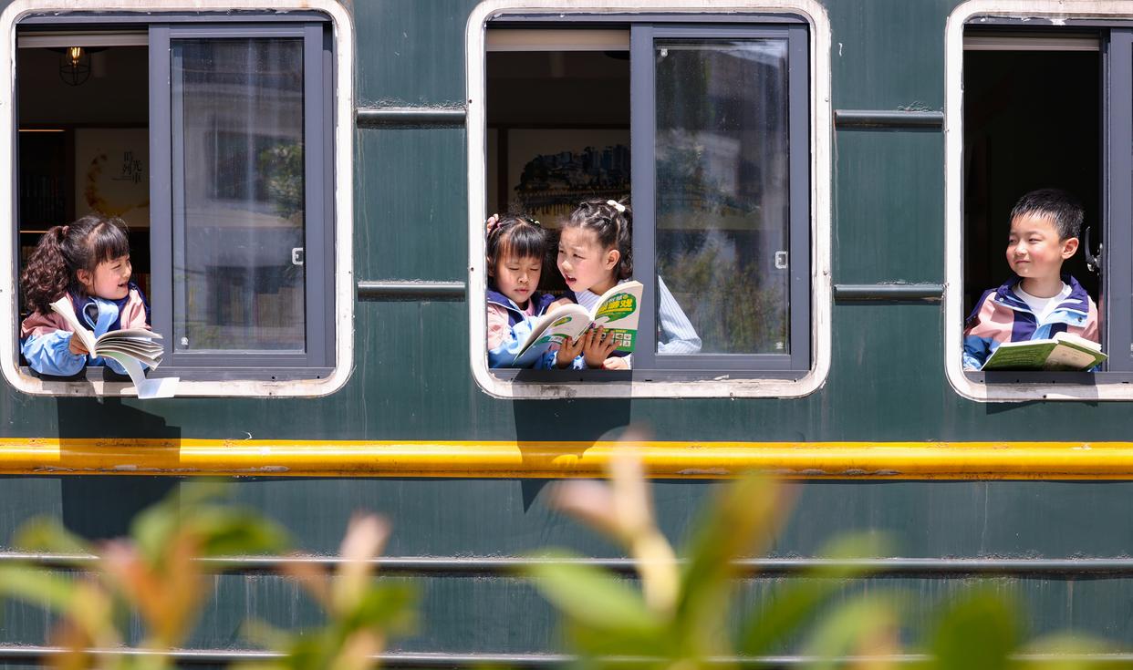 ↑2026年4月17日,小朋友们在贵州省铜仁市玉屏侗族自治县城区火车书屋内阅读书籍。CICPHOTO/胡攀学 摄