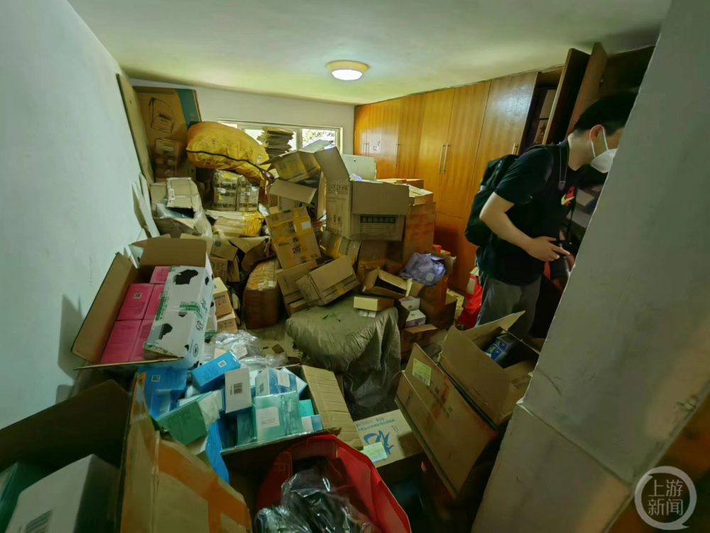 ▲嫌疑人在家中、车库存放了大量临期、过期化妆品。图片来源/上海公安