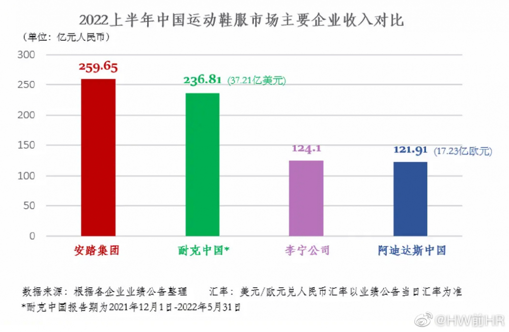 安踏集团表示,今年上半年公司的收入体量相当于相同报告期内1.1个耐克中国、2.1个李宁公司、2.13个阿迪达斯中国。