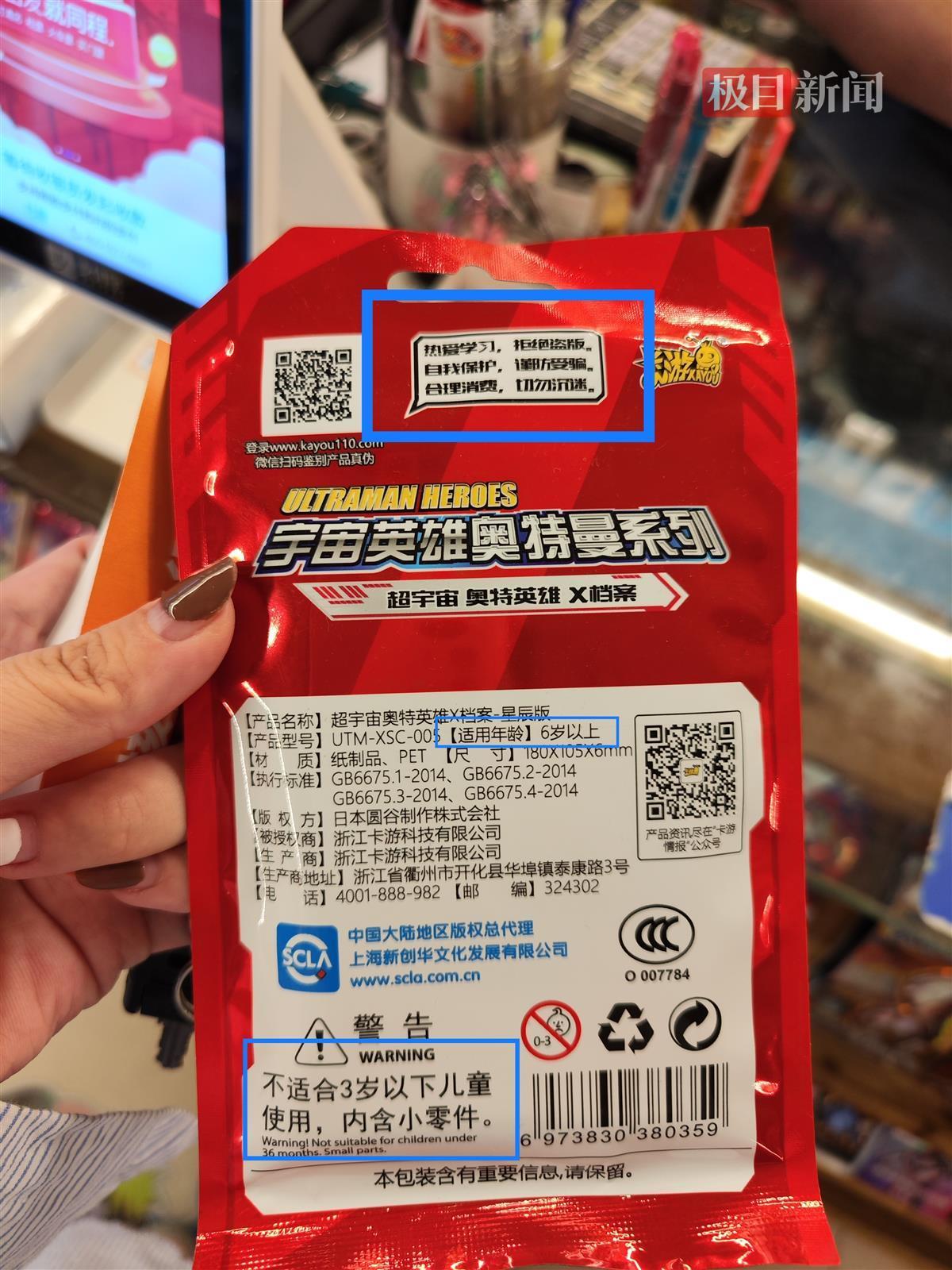 极目新闻记者注意到,尽管奥特曼卡牌包装背面写着:“适用年龄6岁以上”“不适合3岁以下儿童使用,内含小零件。”但仍受到不少6岁以下,甚至更小的小孩喜爱。