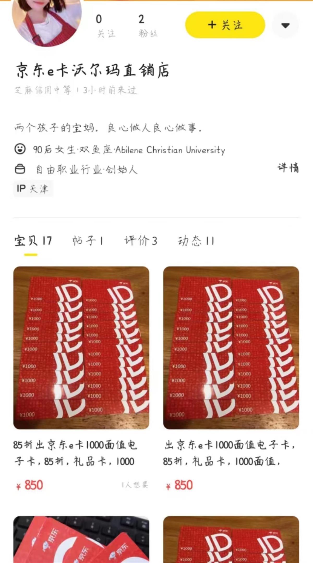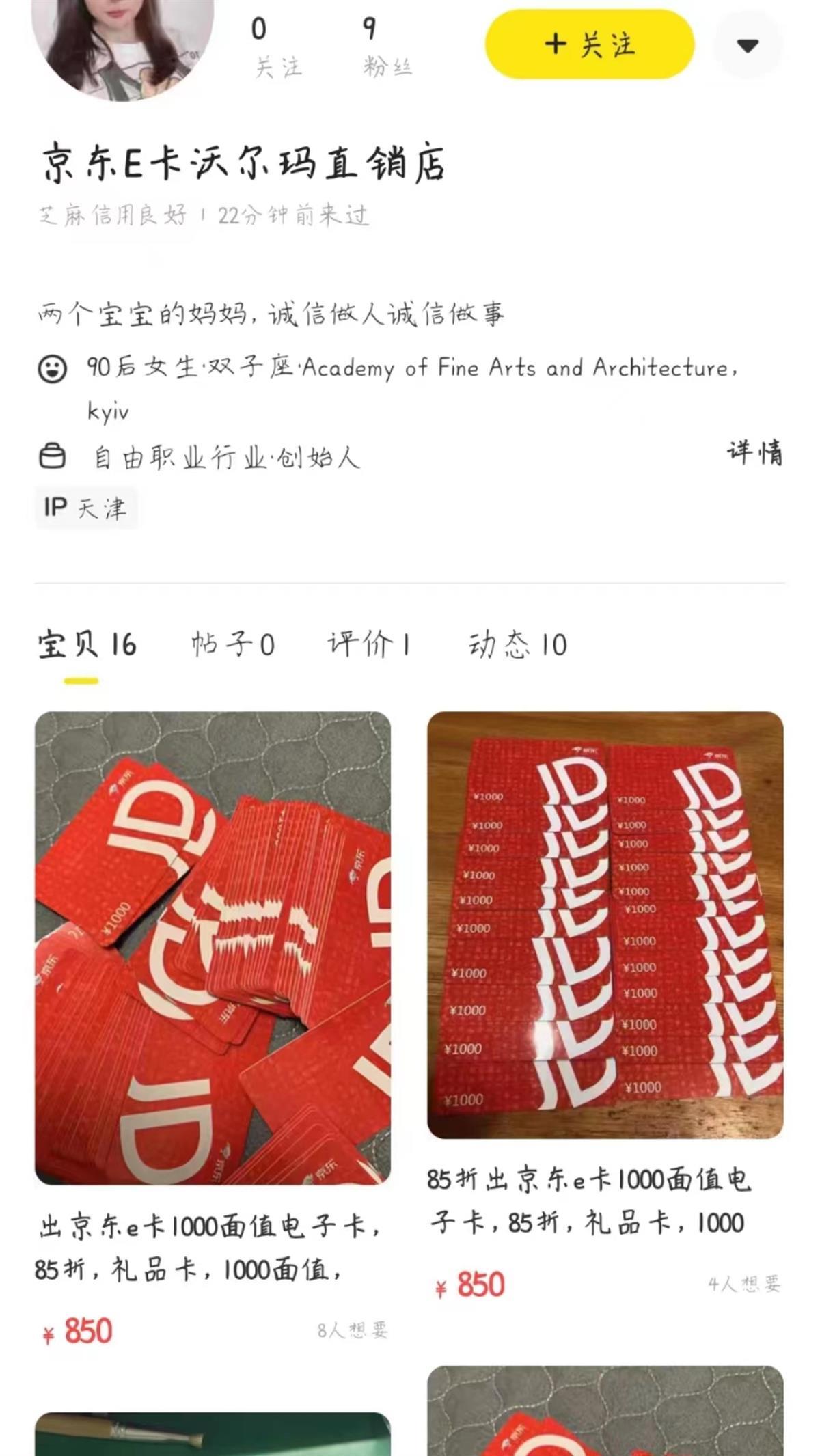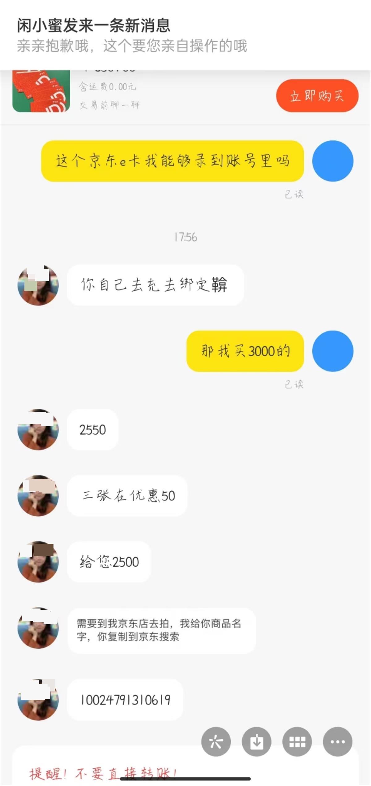 张先生回忆,8月28日,妻子用他的手机,在某二手平台上搜索“**E卡”,找到了几个卖家,“想着在二手平台甩卖的都有折扣,可以薅点羊毛。”一位昵称“**E卡沃尔玛直销店”的卖家进入了其视线。