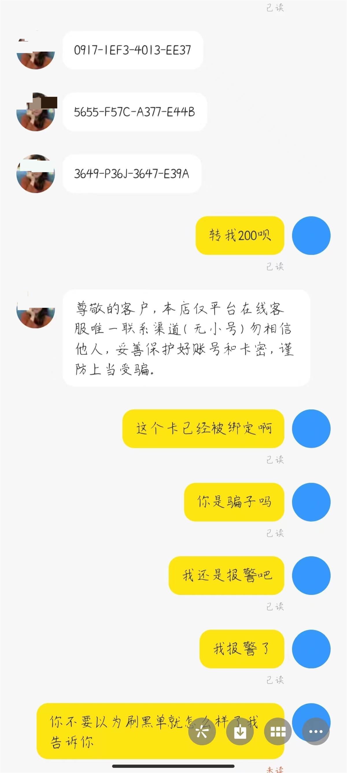随后,对方发来三串字符,号称是**E卡卡密。不过,张先生妻子试验后发现,这三张卡都已经被绑定,也就是说,卡密无效。她赶紧试验自己发给对方的3张沃尔玛电子卡,发现已经被绑定到其他账户,这才意识到被骗。