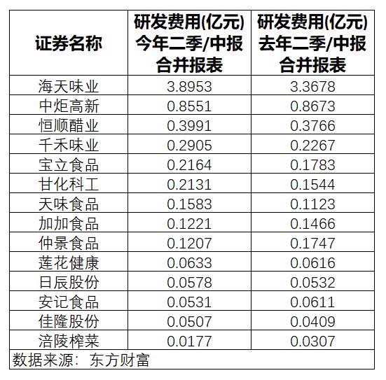 Choice数据显示,今年上半年,14家调味品上市公司的研发费用总计约6.51亿元,比去年同期增长了6000多万元,其中,天味食品的增幅最高。