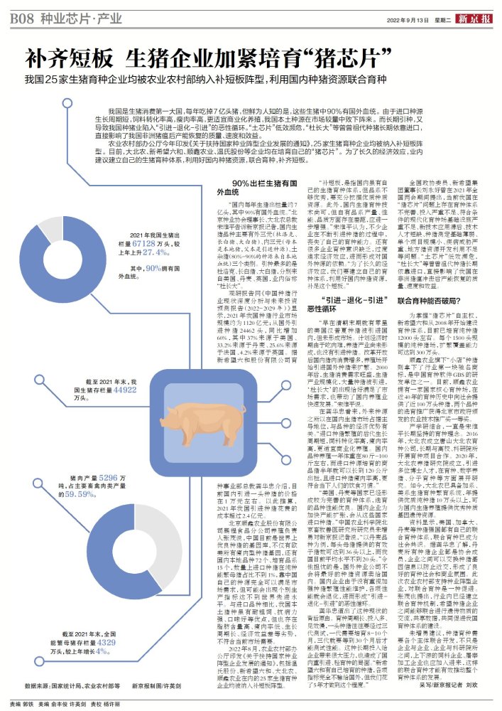 全国政协委员、新希望集团董事长刘永好曾在2021年全国两会期间提出,当前我国在“猪芯片”问题上存在育种体系不完善、投入严重不足、符合条件的现代化育种场基础设施严重不足、新技术应用滞后、技术人才短缺、种猪测定基础薄弱、单个项目规模小、疾病威胁严重、地方猪资源开发利用不足等问题。“土芯片”低效濒危,“杜长大”等曾曾祖代种猪长期依靠进口,直接影响了我国在非洲猪瘟冲击后产能恢复的质量、速度和效益。