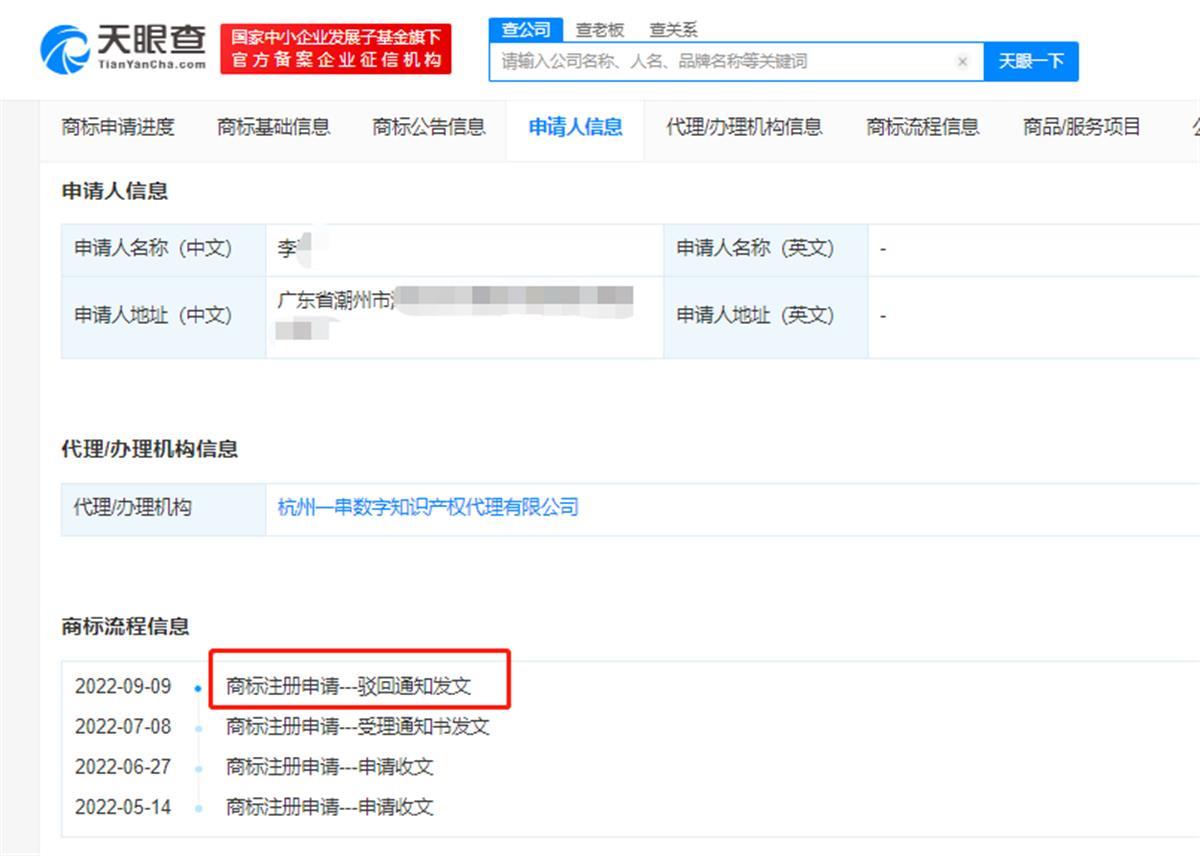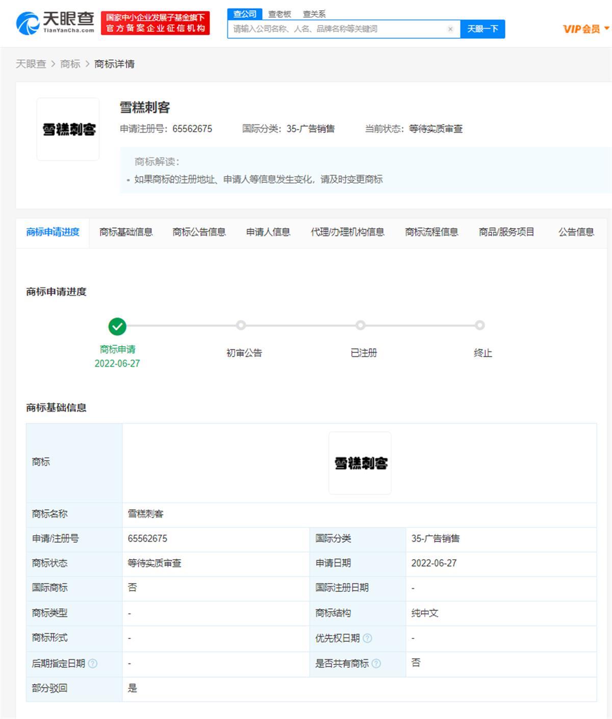 天眼查APP显示,近日,由李某申请注册的“雪糕刺客”商标,流程状态变更为“驳回通知发文”,被驳回商标国际分类为广告销售,申请注册于今年6月。