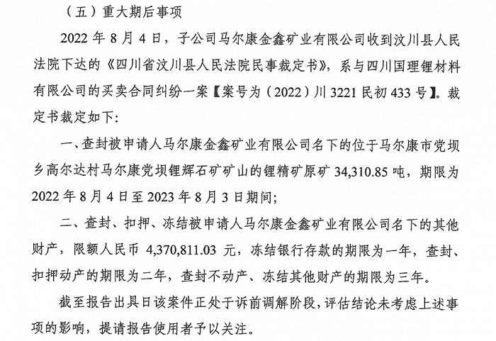 但界面新闻注意到,该资产评估报告还显示,上述探矿权已经于2022年2月13日过期,目前正在办理续期手续。此外,上述采矿权的开采矿种为锂矿(铌矿、钽矿、铍矿、锡矿),面积为2.8336平方公里,生产规模5万吨/年。但因金鑫矿业涉及买卖合同纠纷,马尔康党坝锂辉石矿矿山的锂精矿原矿3.43万吨被查封,期限为2022年8月4日至2023年8月3日。