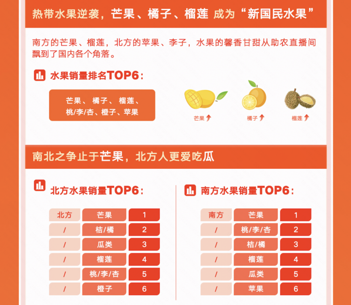 “直播+短视频”一面打通了农产品的销路,一面也满足了人们对各地新鲜瓜果蔬菜的口腹之欲。南方的芒果、榴莲,北方的苹果、李子,水果的馨香甘甜从助农直播间飘到了国内各个角落。《报告》显示,2022年1月至8月期间,快手平台上销量最高的水果TOP6分别是为芒果、橘子、榴莲、桃/李/杏、橙子、苹果,热带水果独霸前三甲。且无论南北方,芒果都格外受欢迎,成为当之无愧的“新国民水果”。