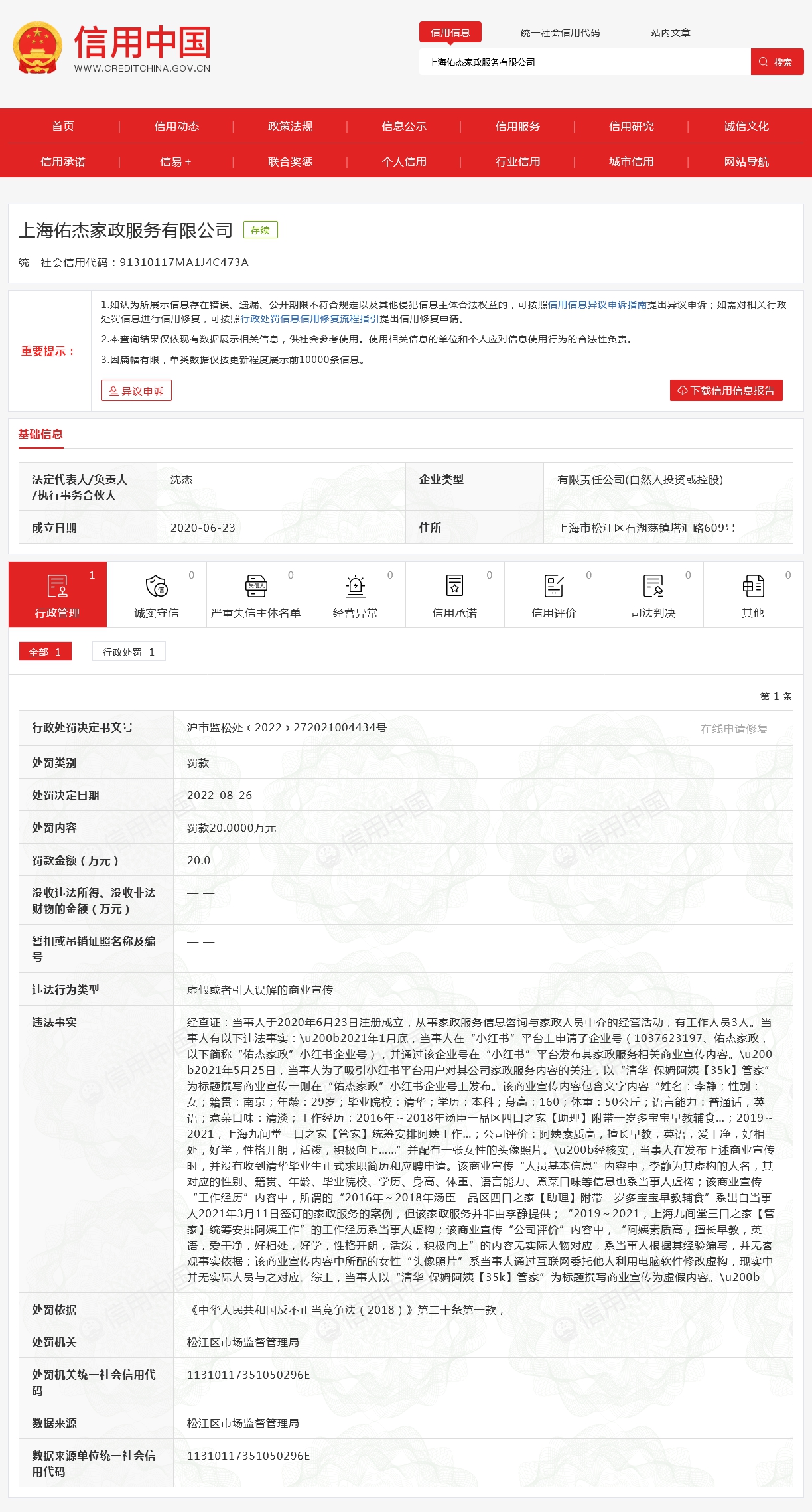 信用中国网站公布的行政处罚信息显示,经查证,2021年1月底,上海佑杰家政服务有限公司在“小红书”平台上申请企业号(以下简称“佑杰家政”小红书企业号),并通过该企业号在“小红书”平台发布其家政服务相关商业宣传内容。