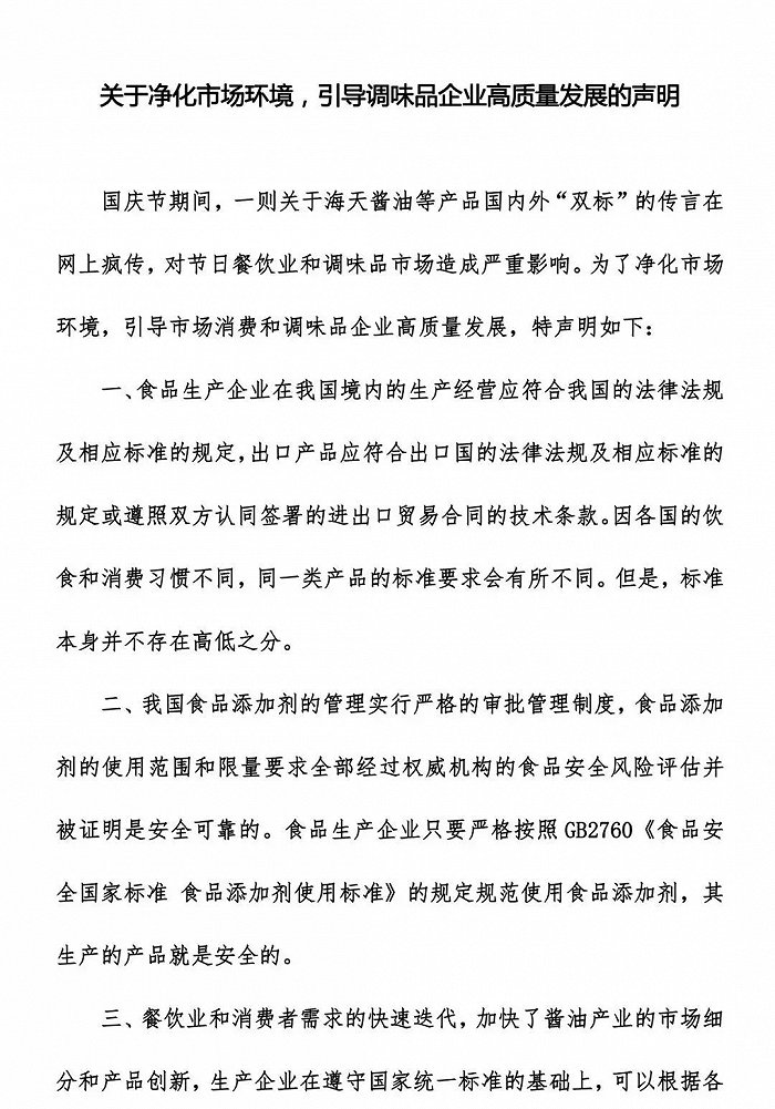 10月5日,中国调味品协会发布声明称,国庆节期间,一则关于海天酱油等产品国内外“双标”的传言在网上疯传,对节日餐饮业和调味品市场造成严重影响。此次事件的发生,对中国调味品的生产和市场造成了不良影响,我们对此深表遗憾,并支持因舆情受到影响的调味品企业依法维权,追究网络造谣者的法律责任。