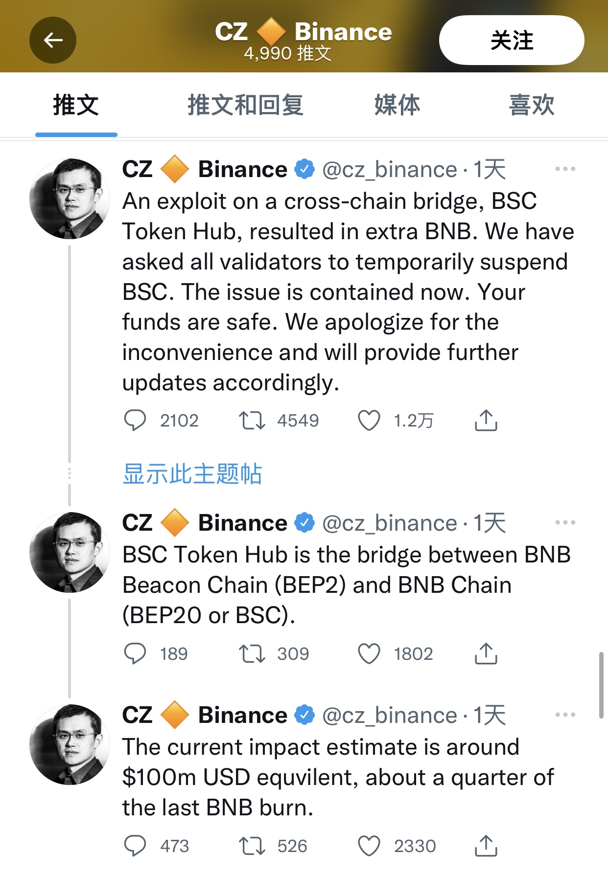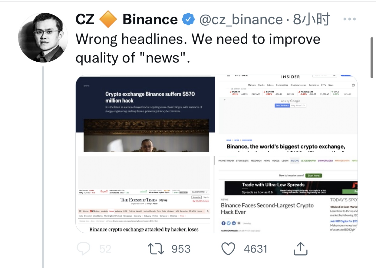 赵长鹏还表示,此次黑客攻击受到影响的金额约1亿美元左右,大约是上次BNB销毁的四分之一规模。他还抨击多家外媒使用错误标题进行报道,标题包含的内容分别有:“加密货币交易所币安蒙受了5.7亿美元的黑客攻击损失”、“价值1亿美元的BNB代币被偷走”、“币安面临着史上第二大加密货币黑客攻击”。