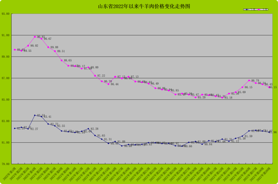 第39周,山东省牛羊肉价格持续回落;活牛价格回升,活羊价格回落。