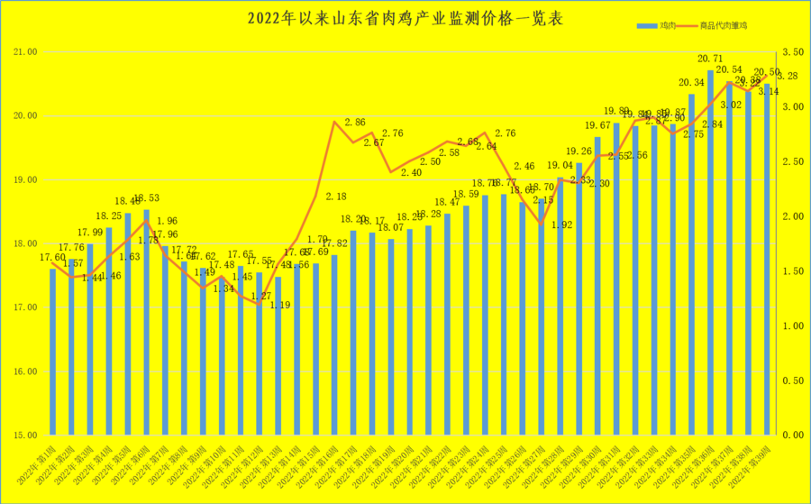 本周鸡肉价格触底回升,商品代肉雏鸡价格继续走高。截至39周末鸡肉市场销售均价为20.50元/公斤,同比升高16.41%,环比回升0.50%。