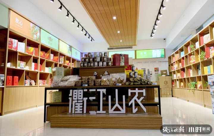 9月一个工作日的午后,位于衢江区茶苑路的衢江山农旗舰店里,有游客在购物,这些有着统一标志的农产品成为衢州旅游的伴手礼之一。