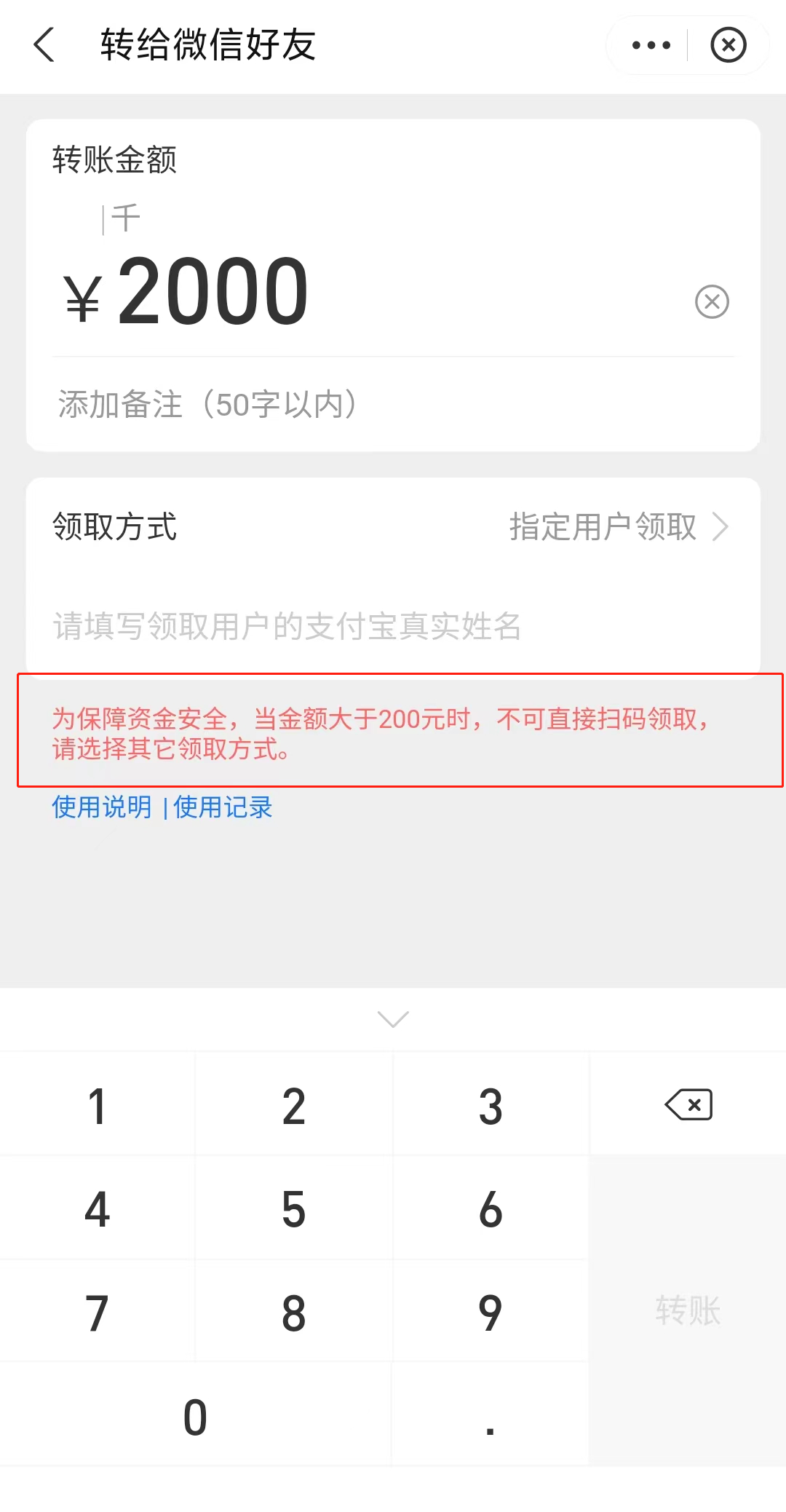 值得注意的是,扫码领取仅限于200元及以下的转账,当转账金额大于200元时,支付宝会提示为保障资金安全,不可直接扫码领取,请选择其他领取方式。