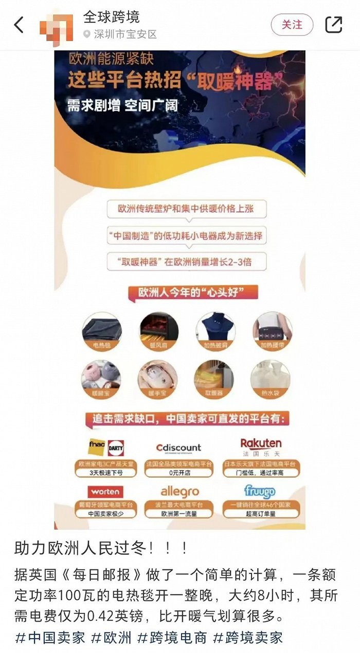 ▲社交平台有跨境卖家在宣传“取暖神器”。图/网络