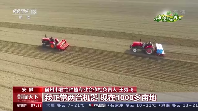 安徽省宿州市君怡种植专业合作社负责人王秀飞:种肥同播,这样速度比较快,一台机器正常一天可以播种100多亩地,我正常两台机器,现在1000多亩地,也就是四五天时间基本就完成播种。