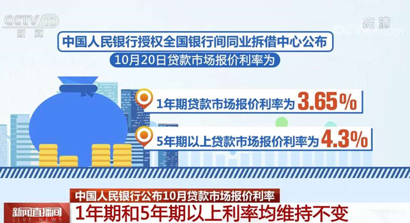 央视网消息:中国人民银行今天(10月20日)公布10月贷款市场报价利率,1年期和5年期以上利率均维持不变。