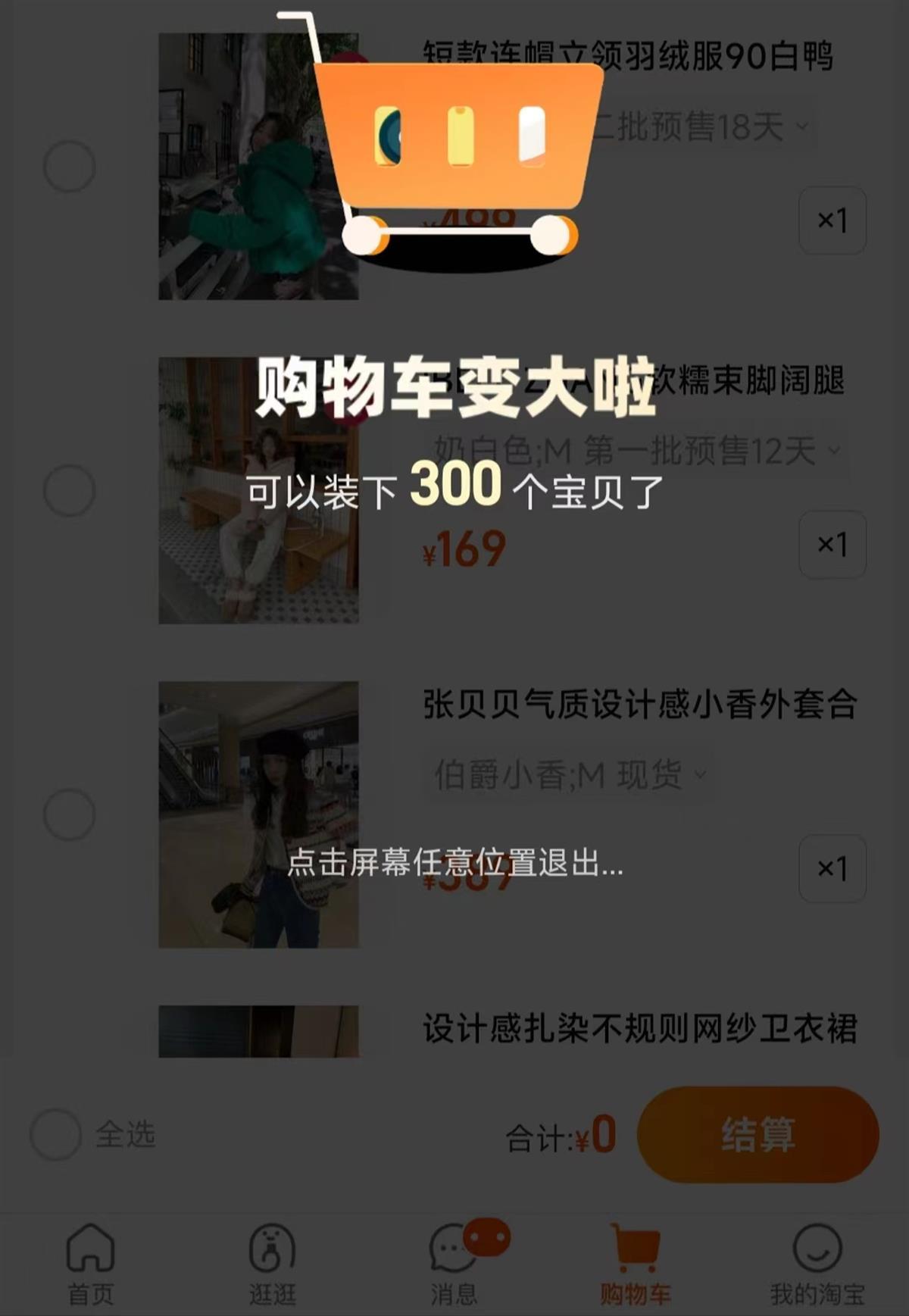 10月20日,极目新闻记者打开淘宝App,进入购物车后,很快看到页面提醒:“购物车变大了,可以装下300个宝贝了。”