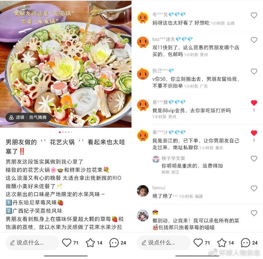 比如,小红书评论区淘宝伪装者瞬间壮大,变成了买家秀评论区。在帅哥自拍下,是清一色的橙色淘宝默认头像,以及“持续回购,期待双11打折”“亲,礼貌询价”“能参与双11满减吗”的评论;一位网友分享了男友烹饪的花式火锅,淘宝伪装者们则调侃:“这么贤惠的男友包邮吗”“88vip去吃打折吗”。