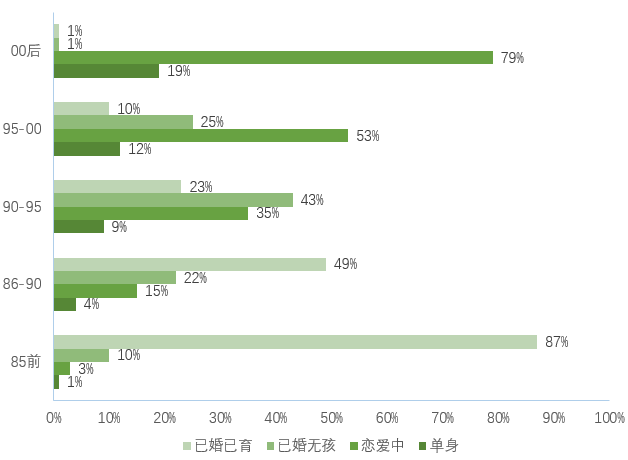 虽然男女比例严重失衡,但程序员群体在婚恋市场比较受欢迎,大部分处于恋爱或者步入婚姻,单身比例较小。具体而言,79%的00后程序员已经脱单,在90-95年之间出生的程序员中,有66%的人处于恋爱或结婚状态。有一半年龄在35岁左右的程序员已经组建了美满的家庭,拥有妻子和孩子。
